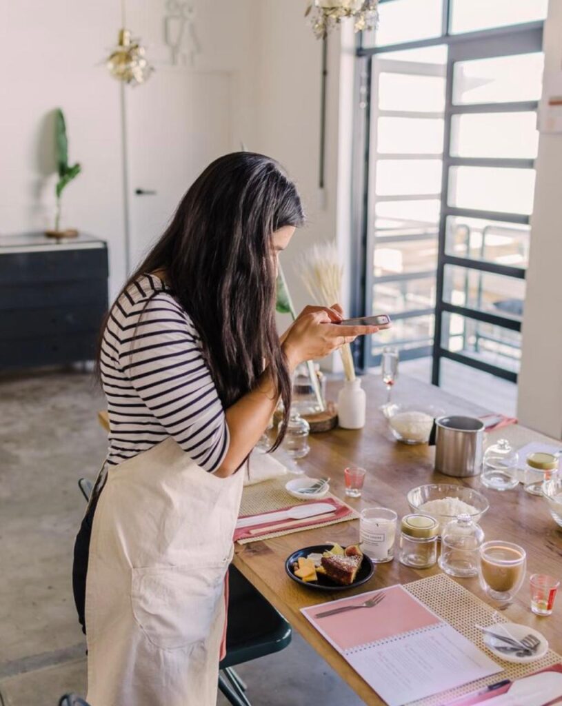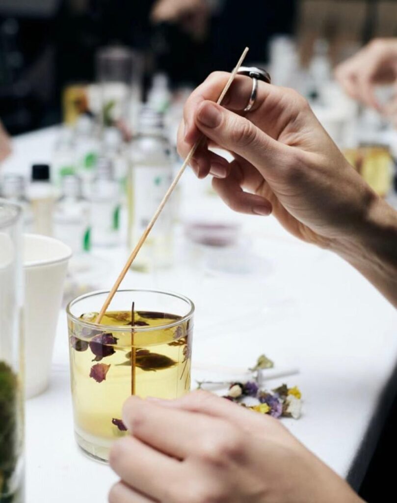 Close-up of crafting candles with soy wax, mixing ingredients indoors with wooden tools.